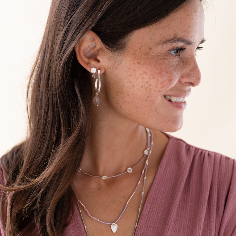Discover our Attracted Rose Quartz Silver Plated Earrings by A Beautiful Story. They are handmade of silver-plated brass and feature a large moonstone gemstone. These earrings have a length of 4.5 centimeters.