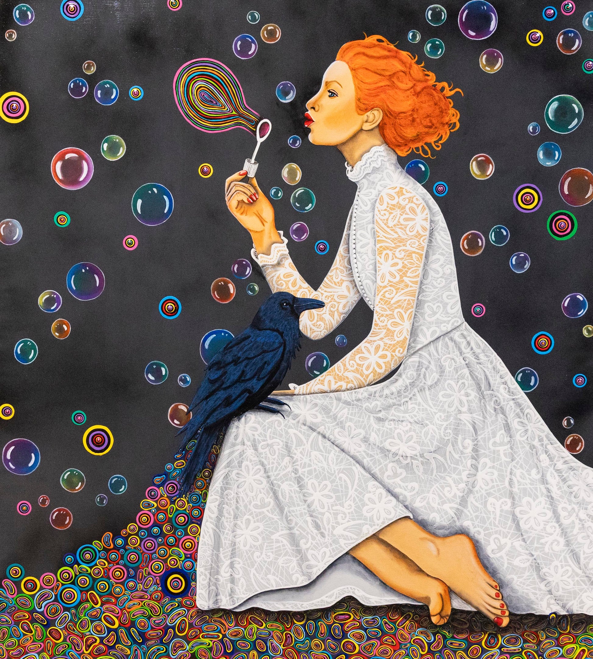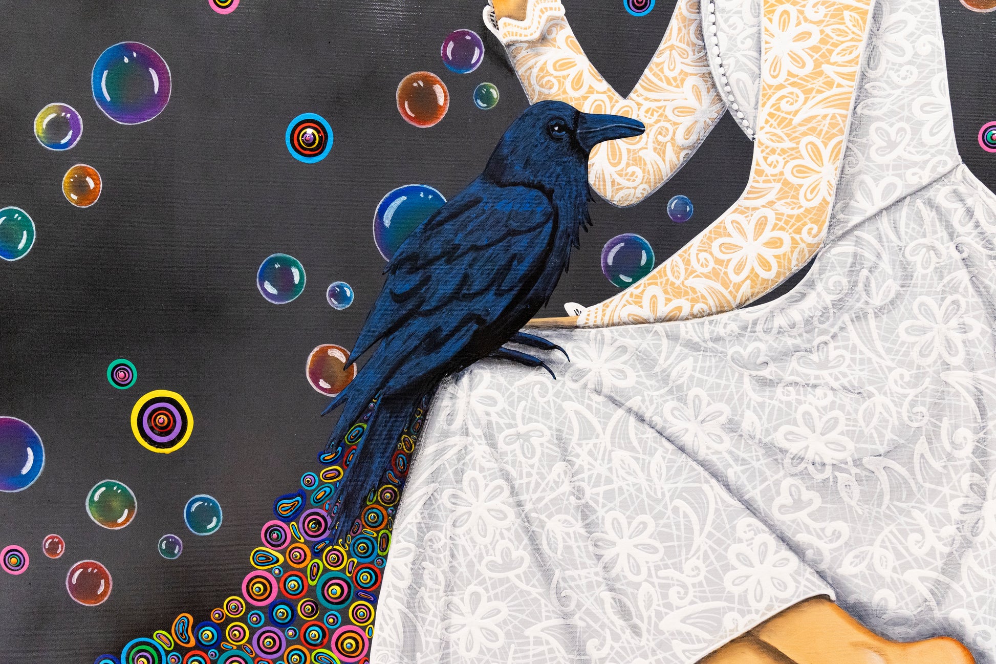 At her side sits a raven, keeper of secrets and symbol of transformation. The silence around her fills with life through an explosion of colorful dots—my signature style, in which each dot carries its own energy and meaning. A fusion of light and dark, strength and softness, stillness and movement.